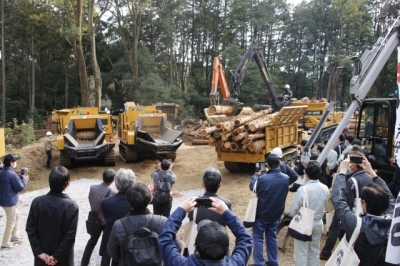 諸岡(諸岡正美代表取締役CEO)は、2月7日~10日、阿見町の同社試験開発・デモセンター(AMIデモセンター)で2年ぶりに新製品発表会を開催した。発表したのは8mリーチのグラップルローダ搭載フォワーダ、タブグラインダー式木材破砕機2機種、電子制御化した新型キャリアダンプ4機種。破砕実演や試乗体験を行い、進化した能力を披露した。