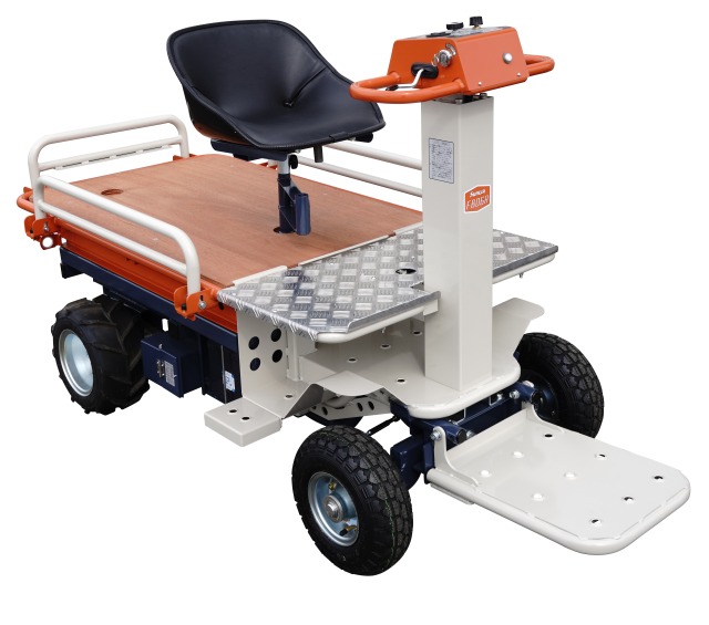 オギハラ工業のリフト式電動作業台車『フルーツボーイ』は、リフトで荷台の高さが500~925㎜まで上下でき、また立っても座っても作業できるため、棚下、運搬などの作業が1台でこなせる。導入農家からは「電動式で低騒音・低振動。三脚での危険な作業をしなくて済むようになった。安全・安心」と、高い評価を得ている。