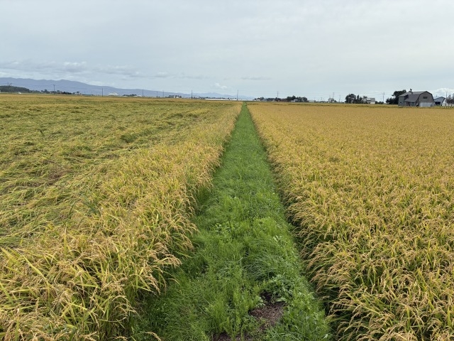 左が無処理区(稲が倒伏)、右がエヌキャッチ区